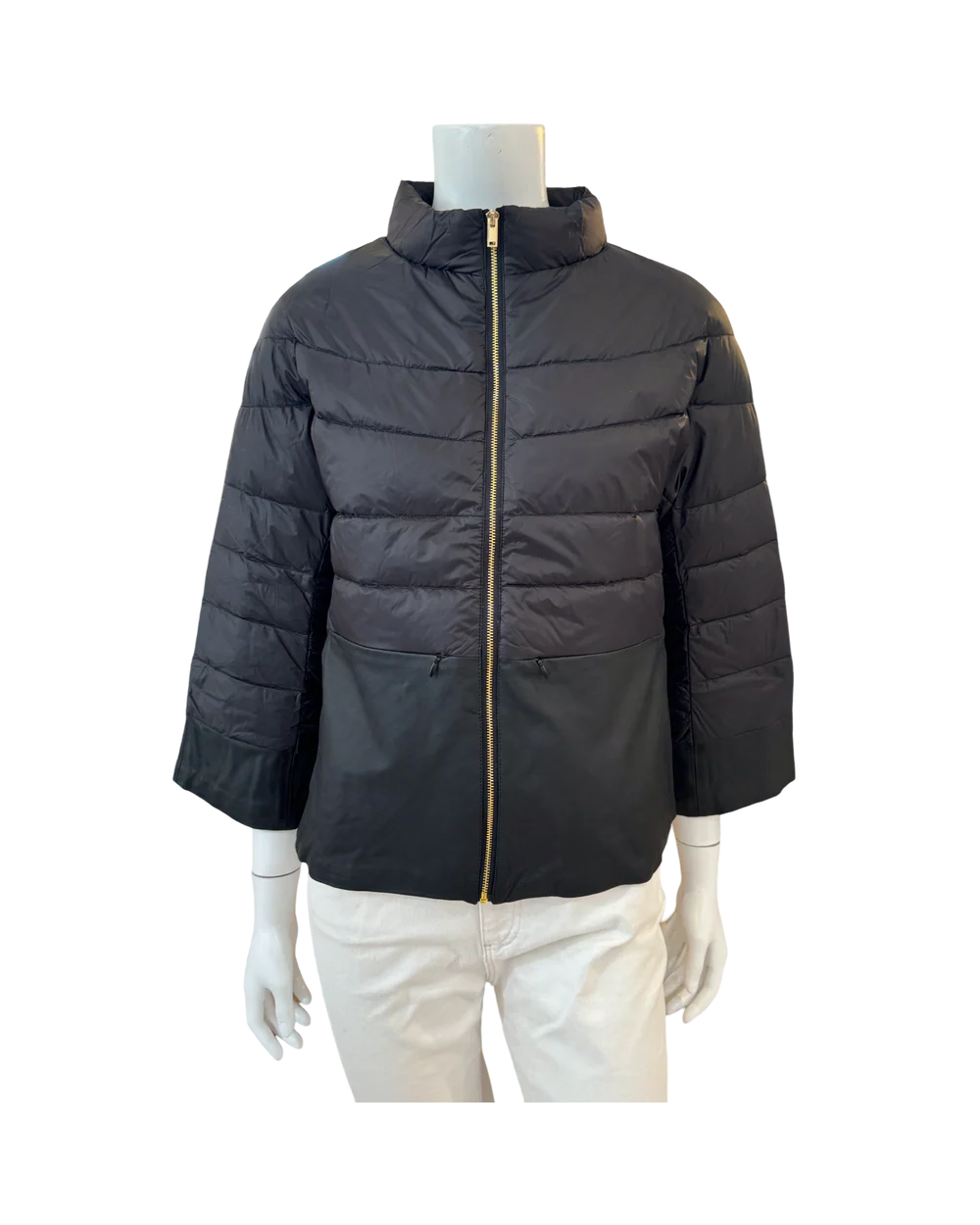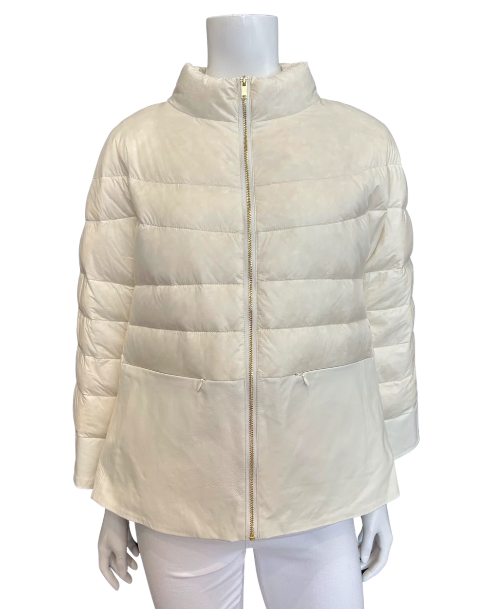 The Audrey combines the warmth of a down puffer jacket with a touch of elegance from the leather flounce. A perfect blend of comfort and fashion.